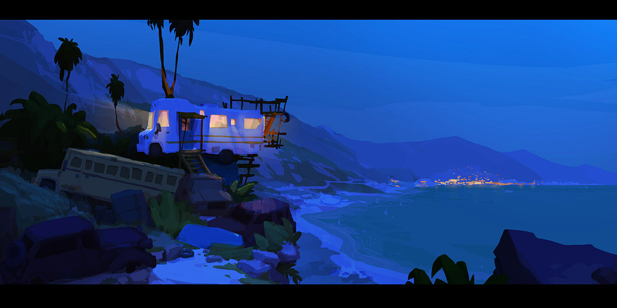 The project concluded in a series of "faux-production-paintings" showing several key-situations from the story.